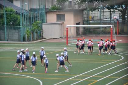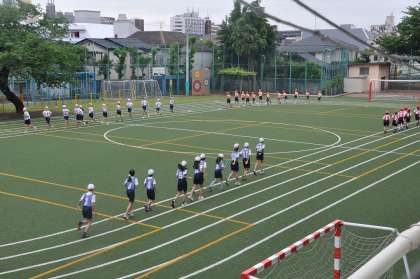 今朝も高学年リレーの練習をおこなっています。まず、軽く走ってから準備運動をしました。