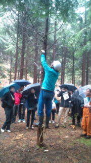 5年生の八ヶ岳自然宿泊体験教室の実地踏査に来ています。増富地区での林業体験の話を聞きながら、枝打ち体験のやり方を見せていただきました。