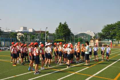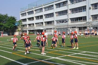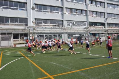 バトンの受け渡しの練習です。バトンの持ち方や、受け渡すときの声かけなどを意識しています。