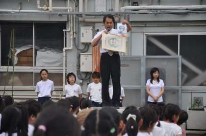 今日の児童朝会では、校長先生から「86回目の開校記念日」「物を大切にしよう」という話がありました。