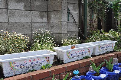 先日栽培委員会の子どもたちが種をまいた人権の花「マリーゴールド」が芽を出し葉を付け始めました。