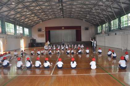 玉入れのやり方を体育館で確認しています。