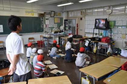 運動会の表現運動のリーダーが、模範の映像を見ながら動きを確認しています。