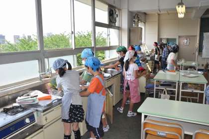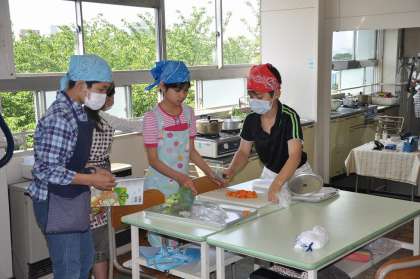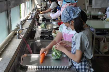 今日は茹で野菜を作る実習です。材料は、にんじん、キャベツ、ブロッコリーです。班で協力して作業を進めています。