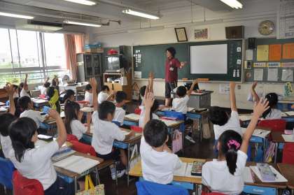 担任の動作を見て、それが何かを考え、発表しています。そしてノートにカタカナで書きました。