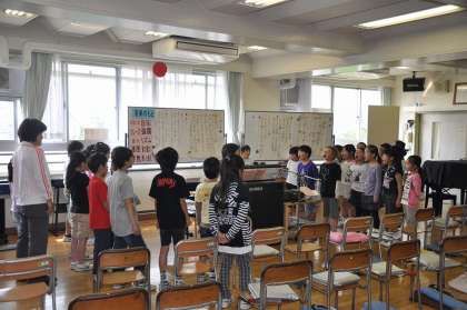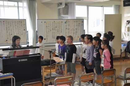紅組と白組に別れ、運動会の歌を元気いっぱい歌っています。