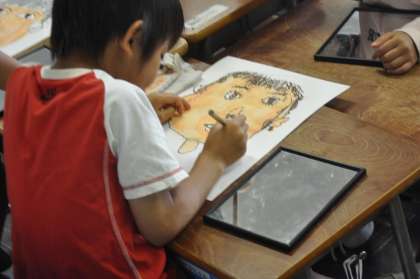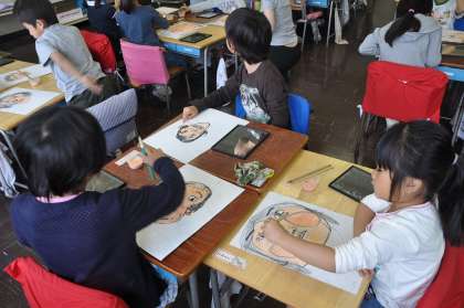 先日鏡を見て描いた自分の顔に色を塗っていきます。