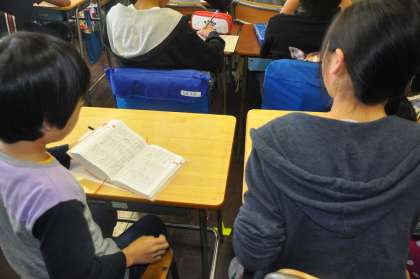 平和祈念標語の清書をしています。さすがは6年生という標語も多くあります。