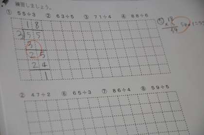わり算の筆算の仕方を確認しています。