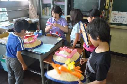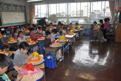 運動会に使う花笠に飾り付けをしています。とても素敵な花笠に仕上がっています。