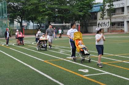 運動会の全体練習に参加し、入場行進の練習をしています。