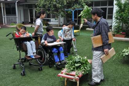 収穫した大根を切っています。葉の部分は、うさぎにあげる予定です。
