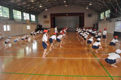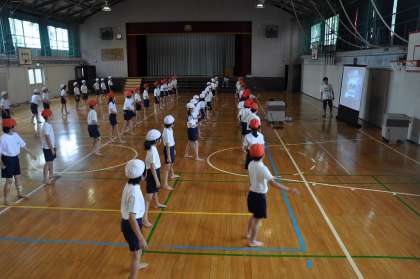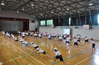 体育館で音楽に合わせた動きの確認をしています。