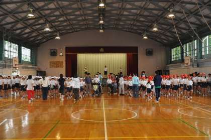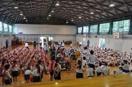 今日は、運動会の全体練習2回目をおこないました。雨のために、体育館で応援練習をおこないました。