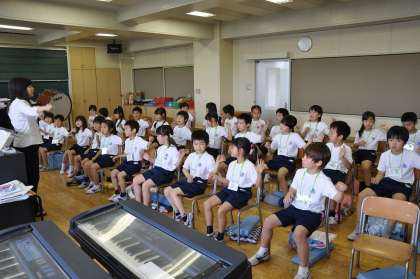 音楽に合わせてリズム打ちをしています。その後、自分たちでリズム打ちを考えています。