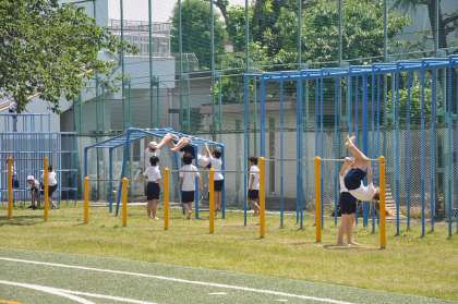 夏のような日の光の下で、子どもたちは元気いっぱい遊んでいます。