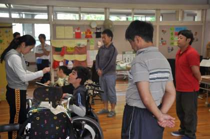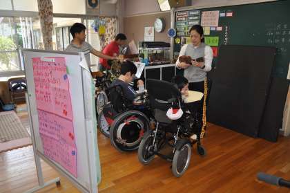 朝の会です。マイクを使って歌を歌っています。
