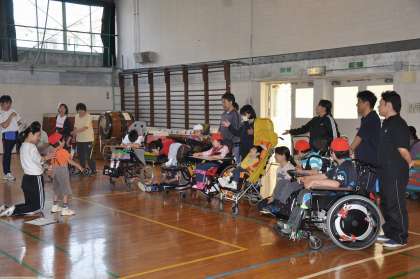 今日は体育館で団体競技の練習をします。あいさつのあと、まずは入場からです。
