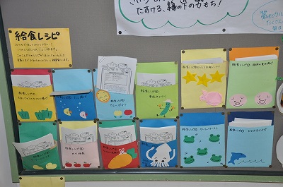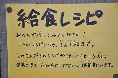 給食室の前に給食の献立レシピがあります。お気に入りのメニューをご家庭で作ってみてはいかがですか。