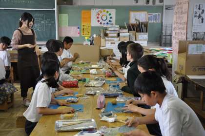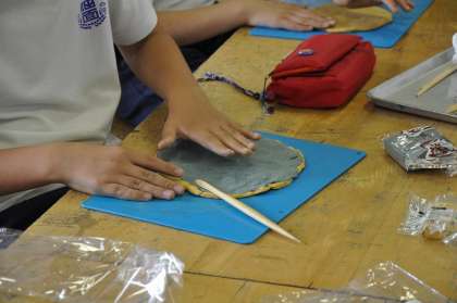 二種類の色の粘土を組み合わせ最初に板を作ります。その板から自分独自の作品を作っていきます。