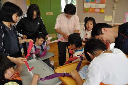 次は、鈴がついたハンカチを音楽に合わせて動かしています。