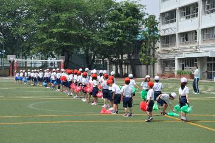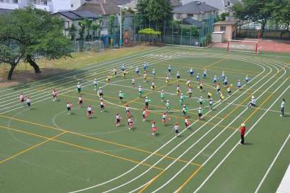 校庭で表現運動の練習をしています。色とりどりのボンボンを持って張り切っています。