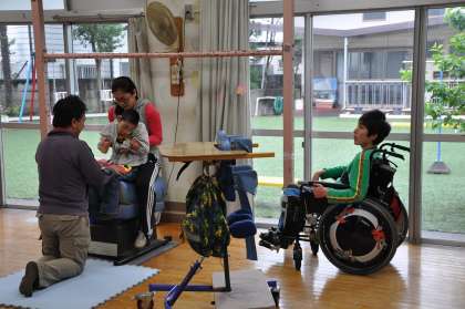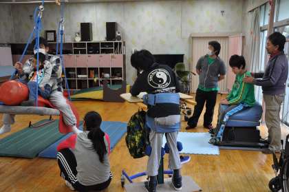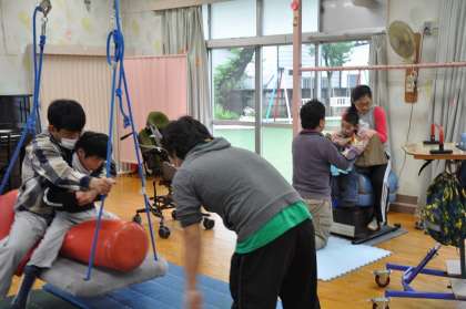 雨のために残念ながらポニー乗馬が中止になってしまったので、集会室で乗馬遊びをしました。2種類に乗り物に交代で乗りました。
