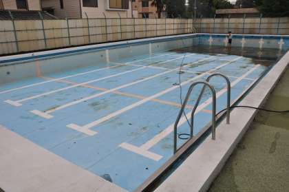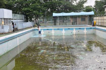 21日からの水泳指導を前に、プールの清掃が行われています。
