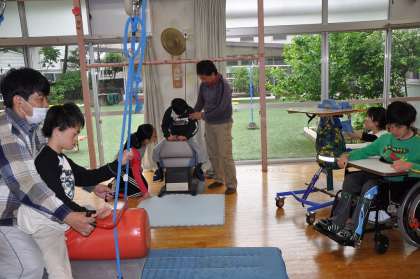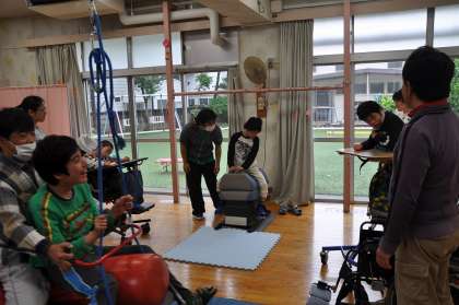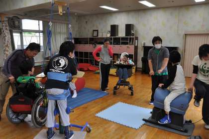 雨のために残念ながらポニー乗馬が中止になってしまったので、集会室で乗馬遊びをしました。2種類に乗り物に交代で乗りました。