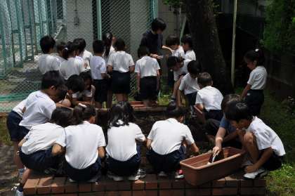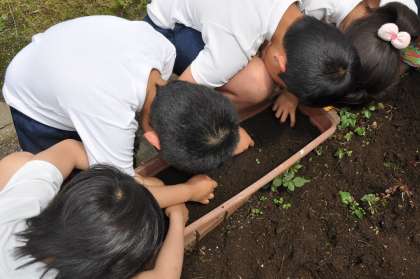 ホウセンカやひまわりの種を植えています。