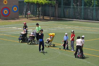 先日、体育館でやってみた団体種目を、運動会当日と同じように校庭で練習しました。