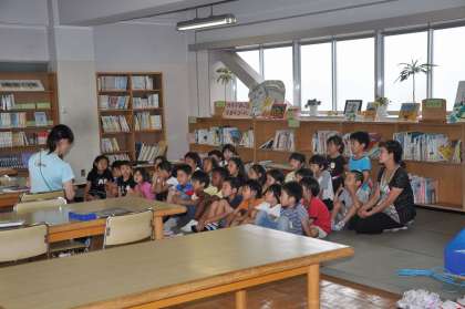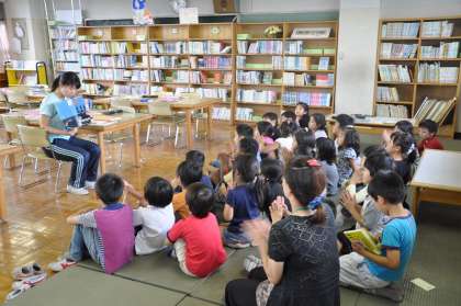子どもたちは図書室で担任の読み聞かせを聞いています。