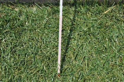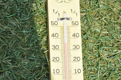 低学年リレーの練習が終わり、子どもたちがいなくなった校庭の人工芝の温度を測ってみました。人工芝の上の気温は37度、人工芝の表面の温度は45度ありました。