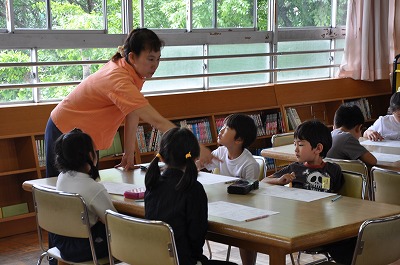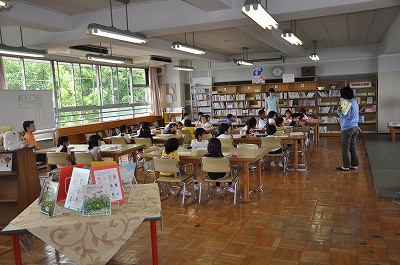 学校図書館支援員の指導で図書室の使い方や本の扱い方などを学んでいます。