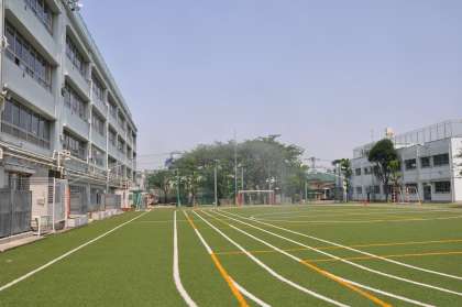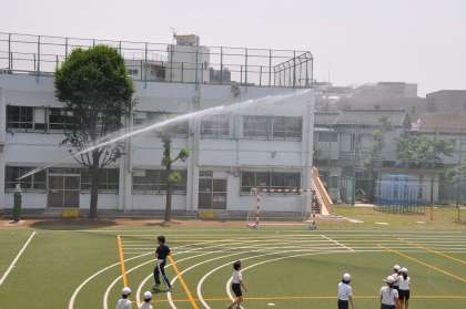 今日のように暑い日は、熱中症予防と足の低温やけど防止のために定期的に散水して温度を下げるようにしています。散水後の人工芝の表面温度を測ったところ、35度まで下がっていました。また、運動会の練習がおこなわれていますので、運動前と運動後には必ず子どもたちに水分を補給するように指導しています。
