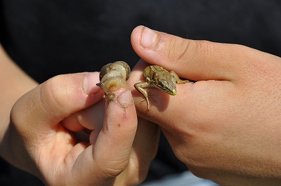 田んぼのそばで、カナヘビやカエルなどを見つけました。
