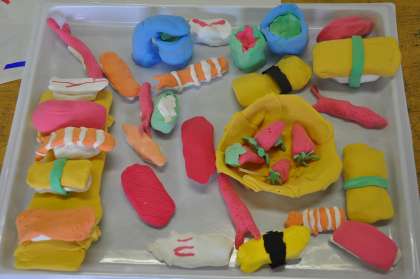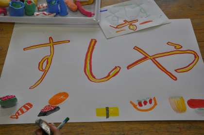 カラフル粘土のお店の商品ができあがったので、看板を作っています。