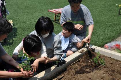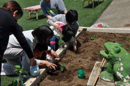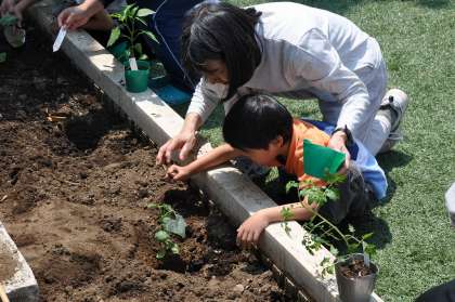 朝の会で決めた野菜を一人一人植えています。