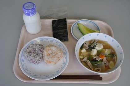 運動会まであと1週間になりました。当日元気に運動会に参加できるように、しっかり食べてほしいと思い、おにぎりにしました。のりを巻いて食べてください。