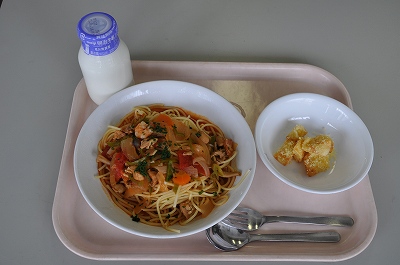 今日は海の幸がたっぷり入ったスープスパゲッティーです。海の幸は、いか、えび、あさりです。