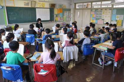 国語の説明文「イルカのねむり方」を教師が範読しています。