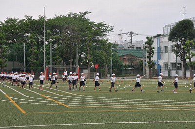 入場後、音楽に合わせた玉入れの練習をしています。