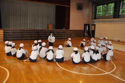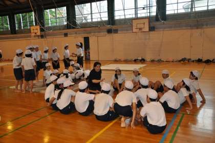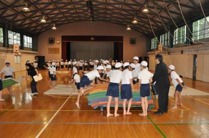 学年合同で組み体操の練習をしています。まず、みんなで協力してマットの準備をした後で、安全や役割についての確認をしています。