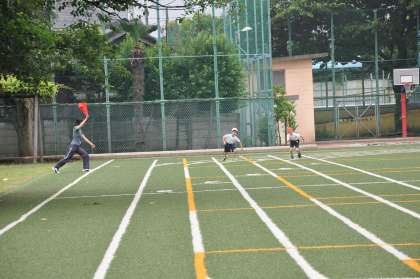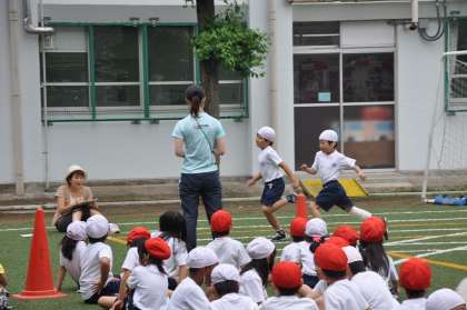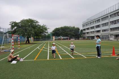 1年生が50m走のタイムを測定しています。