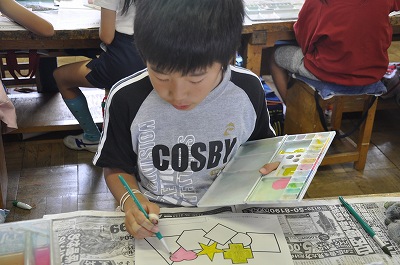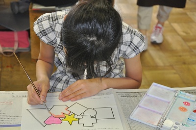 図形に色を塗っています。この練習をこれから先の表現に生かしてほしいと思います。