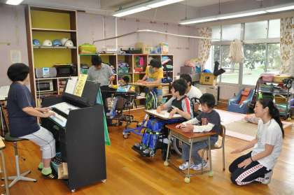 季節の歌として雨の歌を歌っています。楽器も使います。