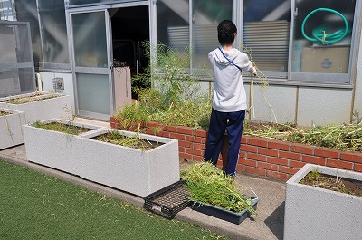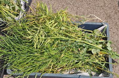 初春からきれいな花を咲かせた菜の花の種をとるために刈り取っています。