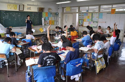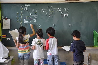 繰り上がりのあるかけ算の筆算の問題に取り組んでいます。