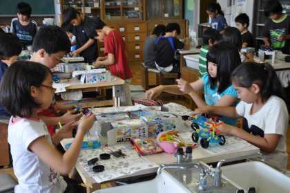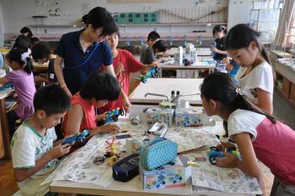 校庭から理科室に戻り、自動車の模型に太陽電池を付けて走らせる準備をしています。