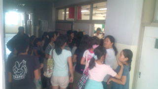 四中にいます。校舎内を回って、今は、3年生の授業を見せていただいています。13時55分